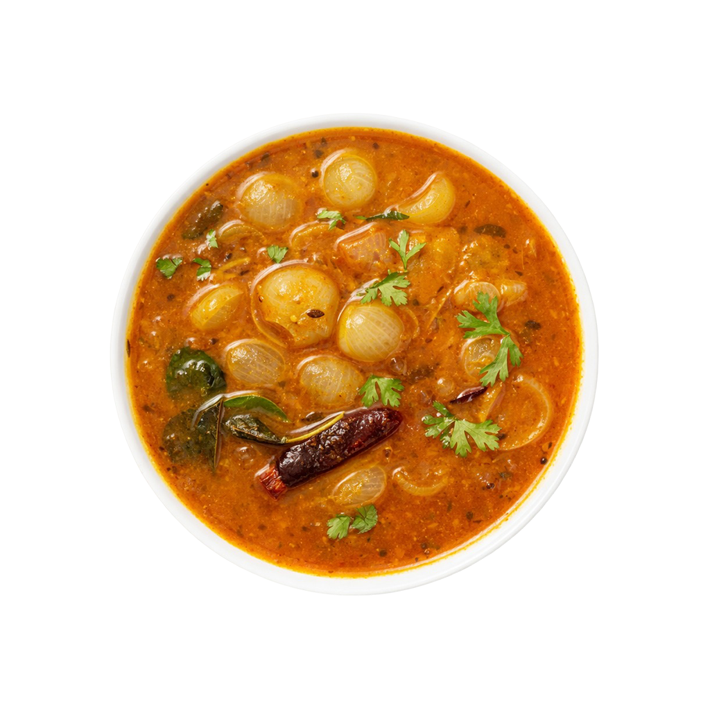 In Tamil kitchens, chinna vengayam (small onions or shallots) are prized for their natural sweetness and deep aroma. Slow-cooked with protein-rich toor dal and tamarind extract, this sambar develops a beautifully balanced flavour — mildly tangy, gently spiced, and deeply comforting. The addition of freshly tempered mustard seeds, curry leaves, and aromatic spices enhances its authentic character.